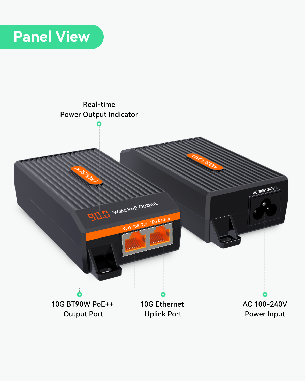 LINOVISION 10G BT 90W PoE++ Injector with LED Screen Single Port IEEE 802.3bt PoE Injector