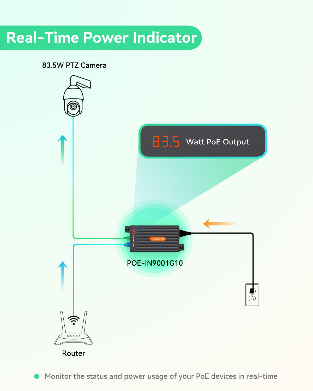 - Real-Time PoE Power Display - Built-in digital LED display shows real-time PoE power output, allowing quick and intuitive status checks and easier troubleshooting.