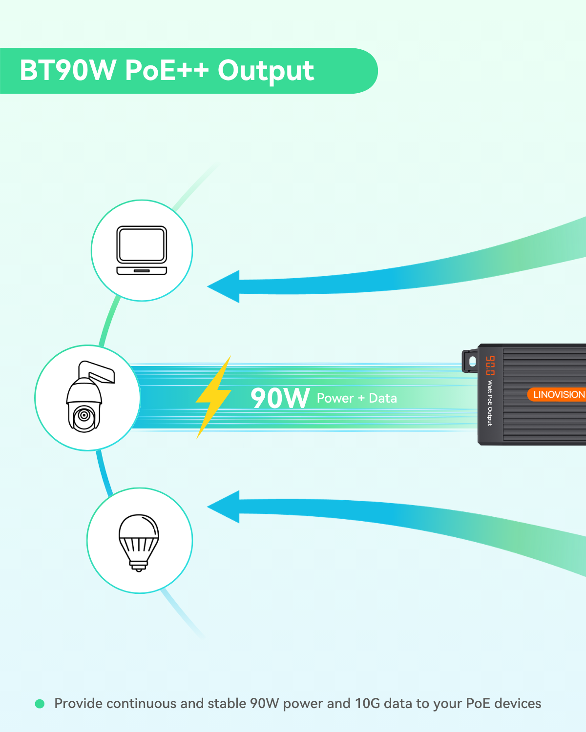 - BT 90W PoE++ INJECTOR - Converts a single Ethernet port into an IEEE 802.3bt 90W PoE++ output for PTZ cameras, PoE lighting, digital signage, and Wireless APs. Backward compatible with IEEE 802.3af/at.