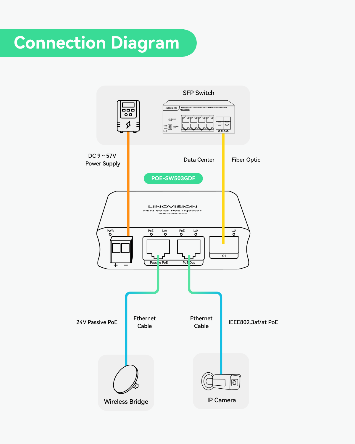 - DC 9~57V Input - Featuring built-in voltage booster, works directly with DC 12V or DC 24V solar battery systems, and outputs standard 48V PoE for regular PoE cameras, no extra DC-DC converter is required.