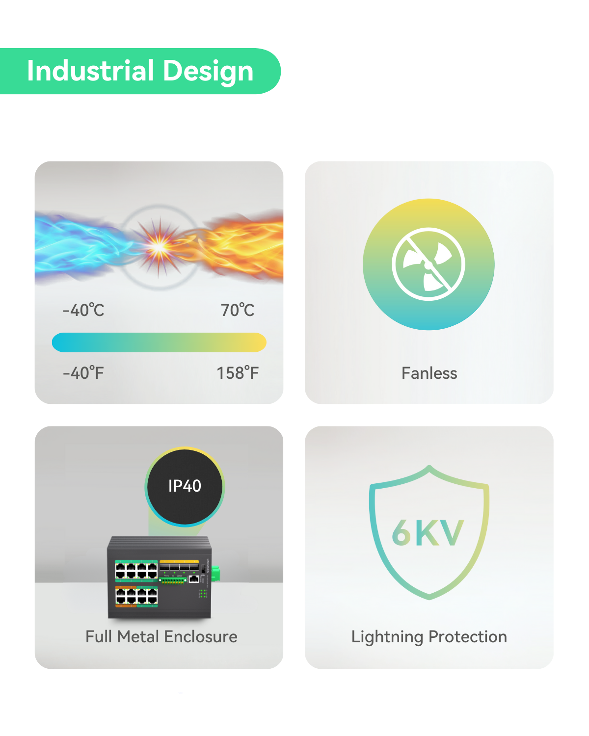 - INDUSTRIAL DESIGN - IP40 metal shell & fanless design. Support DIN-rail. Wide working temperature -40℃ to +70℃. 6KV surge immunity and 8KV ESD protection.
