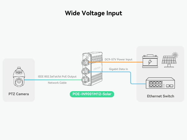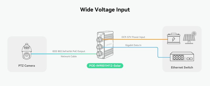 • Wide Input Voltage - Supports a wide input range of 9~57VDC, perfectly suited for use with solar power system and RV/Vehicle/Truck/Bus system or battery (DC12/24/36V input) where need POE ports
