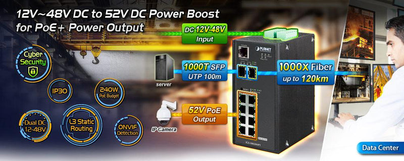 The IGS-10020HPT is a Modbus TCP 8-port industrial switch with PoE capabilities.