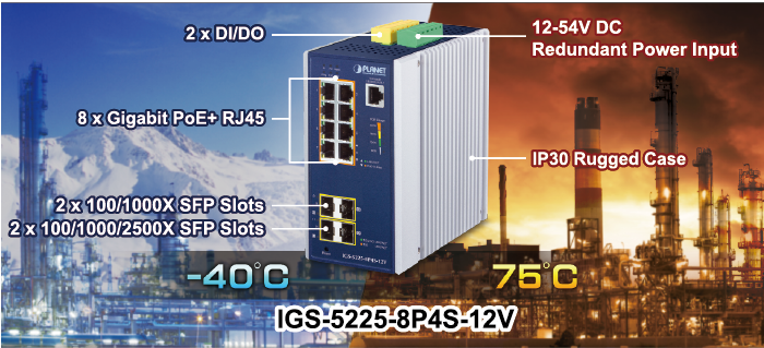 PLANET IGS-5225-8P4S-12V PoE L2+Industrial Managed PoE+ Switch, featuring 8 10/100/1000BASE-T 802.3at PoE+ ports with each port powering up to 36 watts, two 100/1G BASE-X SFP ports and two 100/1000/ 2500 BASE-X SFP ports in an IP30 rugged metal case, can be installed in any difficult environment. It provides user-friendly yet advanced IPv6/IPv4 management interfaces, abundant L2/L4 switching functions, Layer 3 static routing capability, and advanced ITU-G.8032 ERPS Ring technology to improve the rapid self-recovery capability and PLANET intelligent PoE functions for controlling the PoE outdoor IP surveillance and wireless network applications. The IGS-5225-8P4S-12V adopts DC 12~ 54V power boosts technology to solve power source issue but does not require special power supplies. It is able to operate reliably, stably and quietly in the temperature range from -40 to 75°C.