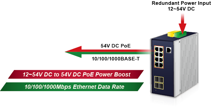 To facilitate the 802.3at PoE usage with commonly-used 12~54V DC power input for transportation and industrial-level applications, the IGS-5225-8P4S-12V adopts the 12~54V DC to 54V power boost technology to solve power source issue but does not require special power supplies. Its wide-ranging voltages design is suitable for worldwide operability with high availability applications requiring dual or backup power inputs.