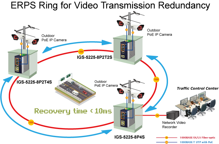 The IGS-5225-8P4S-12V supports redundant ring technology and features strong, rapid self-recovery capability to prevent interruptions and external intrusions. It incorporates advanced ITU-T G.8032 ERPS (Ethernet Ring Protection Switching) technology, Spanning Tree Protocol (802.1s MSTP), and redundant power input system into customer’s industrial automation network to enhance system reliability and uptime in harsh factory environments. In a simple Ring network, the recovery time of data link can be as fast as 10ms.