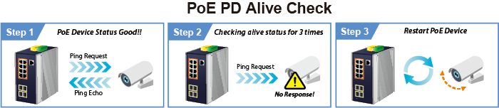 The IGS-5225-8P4S-12V can be configured to monitor connected PD’s status in real time via ping action. Once the PD stops working and responding, the IGS-5225-8P4S-12V will recycle the PoE port power and bring the PD back to work. It also greatly enhances the reliability in that the PoE port will reset the PD power, thus reducing administrator’s management burden.