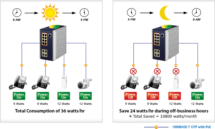 Under the trend of energy saving worldwide and contributing to environmental protection on the Earth, the IGS-5225-8P4S-12V can effectively control the power supply besides its capability of giving high watts power. The built-in “PoE schedule” function helps you to enable or disable PoE power feeding for each PoE port during specified time intervals and it is a powerful function to help SMBs or enterprises save power and money.