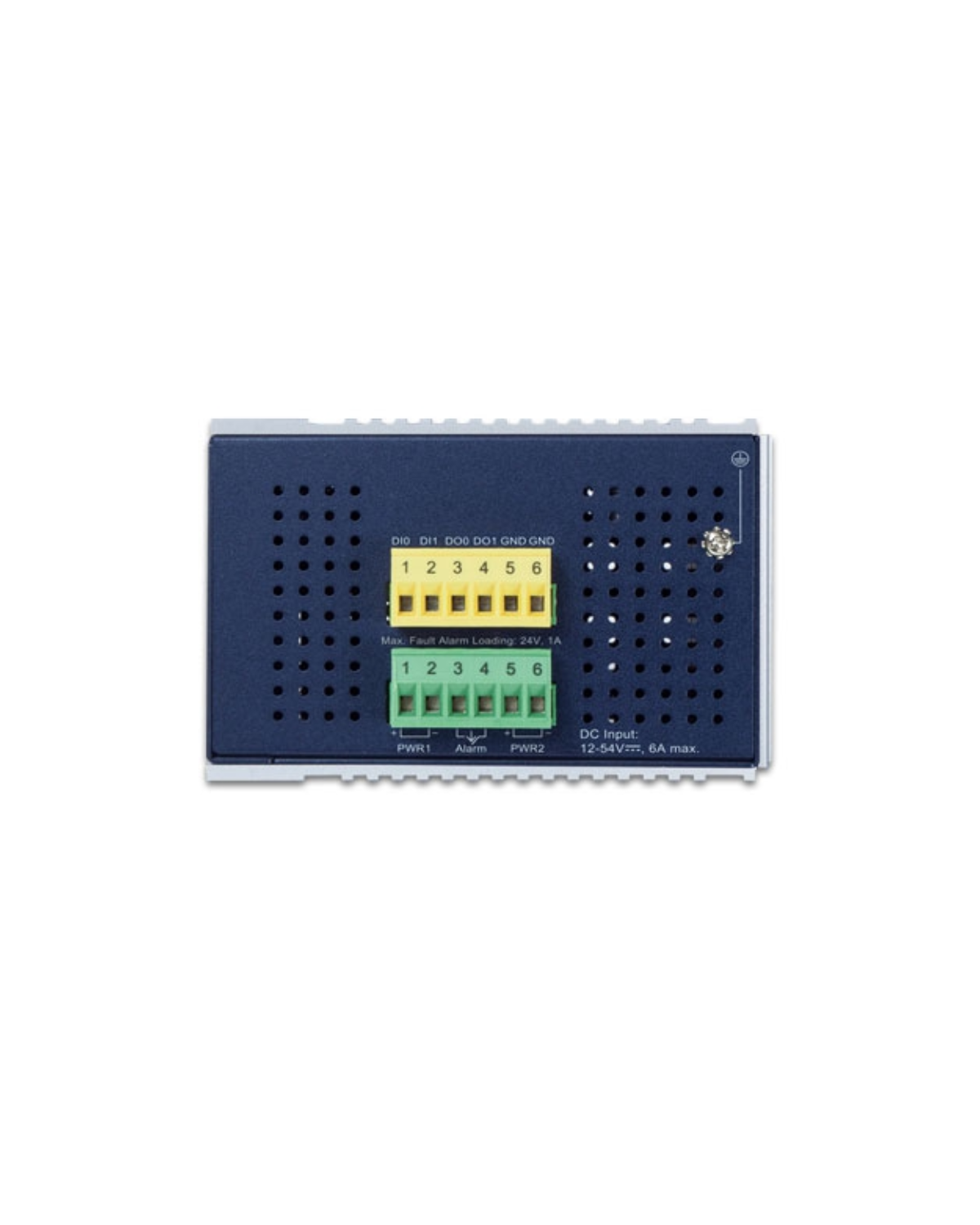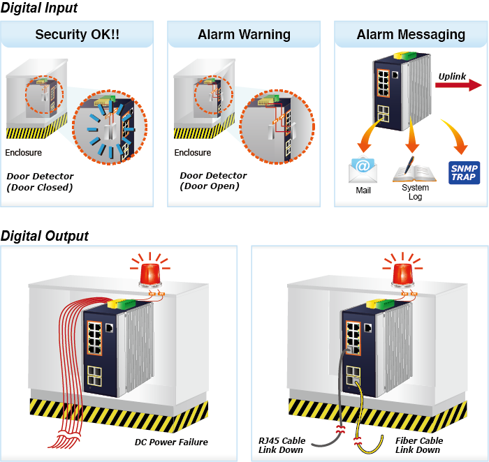 The IGS-5225-8P4S-12V supports Digital Input and Digital Output on its front panel. This external alarm enables users to use Digital Input to detect and log external device status (such as door intrusion detector), and send event alarm to the administrators. The Digital Output could be used to alarm the administrators if the IGS-5225-8P4S-12V port shows link down, link up or power failure.