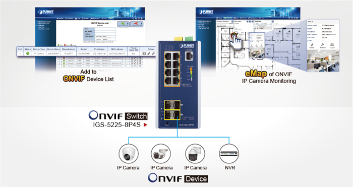 PLANET has developed an awesome feature — ONVIF Support — which is specifically designed for co-operating with video IP surveillances. From the IGS-5225-8P4S-12V GUI, clients just need one click to search and show all of the ONVIF devices via network application. In addition, clients can upload floor images to the switch series making the deployments of surveillance and other devices easy for planning and inspection purposes. Moreover, clients can get real-time surveillance’s information and online/offline status; the PoE reboot can be controlled from the GUI.