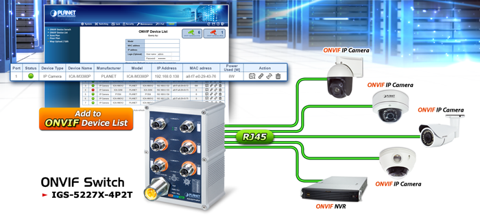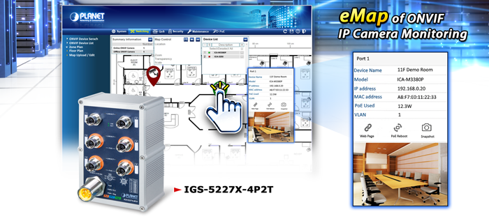 PLANET has developed an awesome feature — ONVIF Support — which is specifically designed for co-operating with video IP surveillances. From the IGS-5227X-4P2T GUI, clients just need one click to search and show all of the ONVIF devices via network application. In addition, clients can upload floor images to the switch series, making the deployments of surveillance and other devices easy for planning and inspection purposes. Moreover, clients can get real-time surveillance’s information and online/offline status; the PoE reboot can be controlled from the GUI.