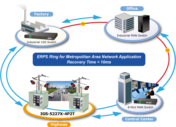 The IGS-5227X-4P2T supports redundant ring technology and features strong, rapid self-recovery capability to prevent interruptions and external intrusions. It incorporates advanced ITU-T G.8032 ERPS (Ethernet Ring Protection Switching) technology, Spanning Tree Protocol (802.1s MSTP), and redundant power input system into customer’s industrial automation network to enhance system reliability and uptime in harsh factory environments. In a simple Ring network, the recovery time of data link can be as fast as 10ms.