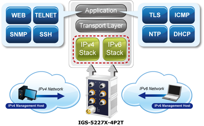 The IGS-5227X-4P2T not only provides ultra high transmission performance, and excellent Layer 2 and Layer 4 technologies, but also Layer 3 IPv4/IPv6 VLAN routing feature which allows to cross over different VLANs and different IP addresses for the purpose of having a highly-secure, flexibly-managed and simple networking application.