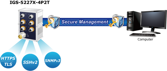 The IGS-5227X-4P2T supports SSHv2, TLS and SSL protocols to provide strong protection against advanced threats. It includes a range of cybersecurity features such as DHCP Snooping, IP Source Guard, ARP Inspection Protection, 802.1x port-based and MAC-based network access control, RADIUS and TACACS+ user accounts management, SNMPv3 authentication, and so on to complement it as an all-security solution.