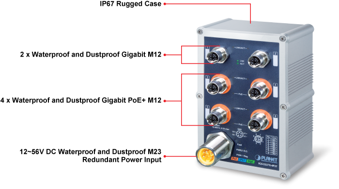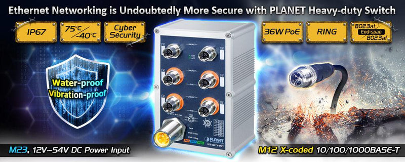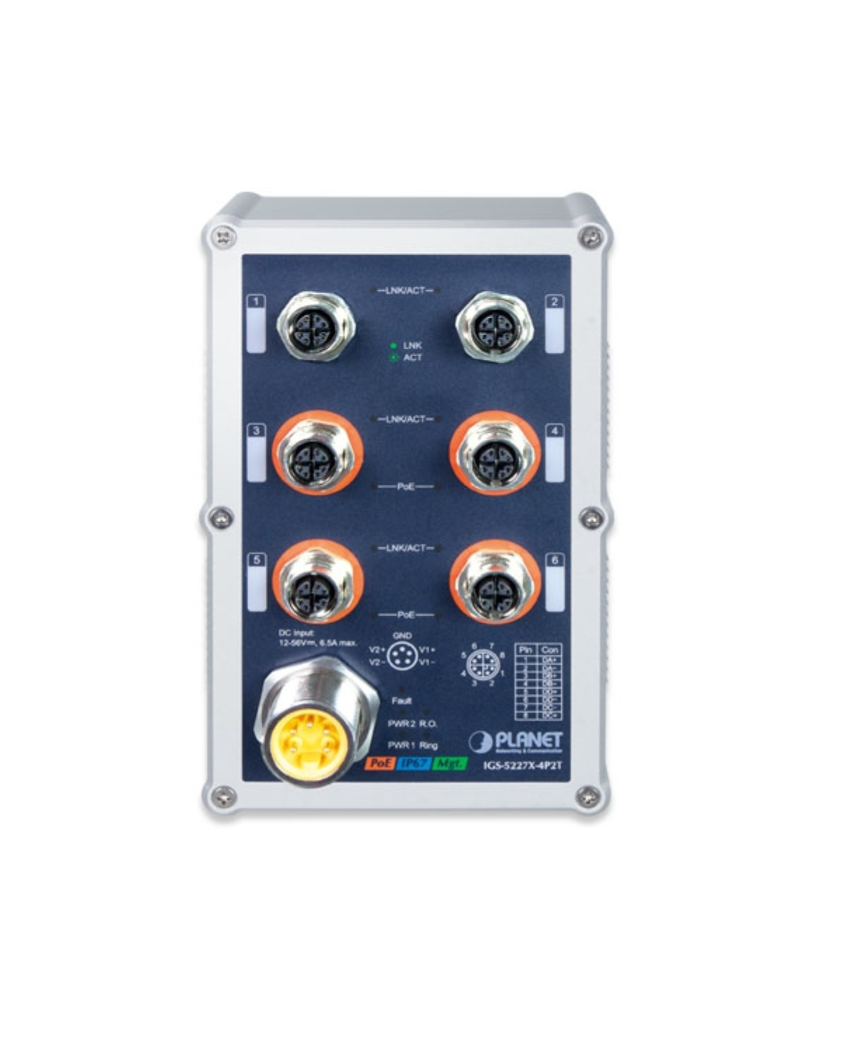 PLANET IGS-5227X-4P2T, an Industrial Layer 2+ Managed Ethernet Switch, comes with an IP67-rated industrial case, 4-port 10/100/1000T 802.3at PoE+, 2-port 10/100/1000T, and static Layer 3 routing, providing a high level of immunity against electromagnetic interference and heavy electrical surges which are usually found on plant floors or in curb-side traffic control cabinets. The IGS-5227X-4P2T can be easily mounted on a DIN rail or wall taking up less space. Each of the four Gigabit PoE+ ports provides 36 watts of power, which means a total power budget of up to 144 watts can be utilized simultaneously without considering the different types of PoE applications being employed. It also provides a quick, safe and cost-effective Power over Ethernet network solution to IP security surveillance for small businesses and enterprises.