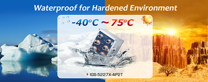The IGS-5227X-4P2T is equipped with a 6-port 10/100/1000BASE-T auto-negotiation dustproof M12 connector with 4-port IEEE 802.3at PoE+ (Port 3 to Port 6); each PoE port provides 36 watts PoE output. The M12 connector provides tight and strong connection, and guarantees stable Ethernet operation performance under high vibration and shock environment. It comes with the industrial protection rating of IP67 capable of withstanding humidity, dirt, dust, shock, vibrations, heat and cold. The IGS-5227X-4P2T is able to operate under the temperature range from -40 to 75 degrees C. All these features ensure the highest level of reliability for mission-critical applications in any difficult environment.