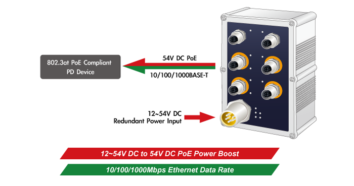 To facilitate the 802.3at PoE+ usage with commonly used 12~56V DC power input for transportation and industrial-level applications, the IGS-5227X-4P2T adopts 12~54V DC to 54V power boost technology to solve power source issue but does not require special power supplies. The IGS-5227X-4P2T provides an integrated power solution with a wide range of voltages (12~56V DC) for worldwide operability. It also provides dual-redundant, reversible polarity 12~56V DC power supply inputs for high availability applications.