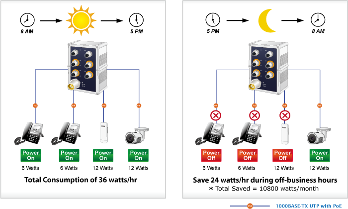 Besides being used for IP surveillance, the IGS-5227X-4P2T is certainly applicable to build any PoE network including VoIP and wireless LAN. Under the trend of energy saving worldwide and contributing to the environmental protection on the Earth, the IGS-5227X-4P2T can effectively control the power supply besides its capability of giving high watts power. The “PoE schedule” function helps you to enable or disable PoE power feeding for each PoE port during specified time intervals and it is a powerful function to help SMBs and enterprises save energy and budget.