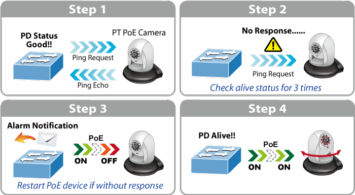 The IGS-5227X-4P2T can be configured to monitor connected PD’s status in real time via ping action. Once the PD stops working and responding, the IGS-5227X-4P2T will recycle the PoE port power and bring the PD back to work. It also greatly enhances the reliability in that the PoE port will reset the PD power, thus reducing administrator’s management burden.