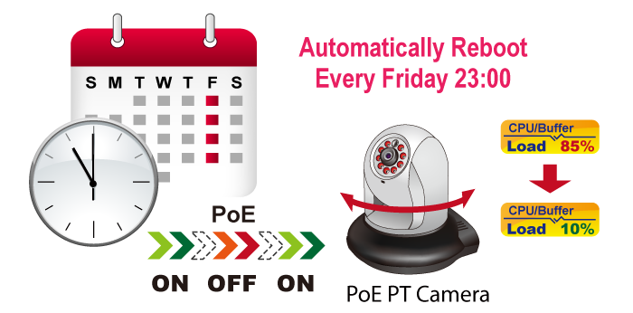 The IGS-5227X-4P2T allows each of the connected PoE IP cameras or PoE wireless access points to reboot at a specific time each week. Therefore, it will reduce the chance of IP camera or AP crash resulting from buffer overflow.