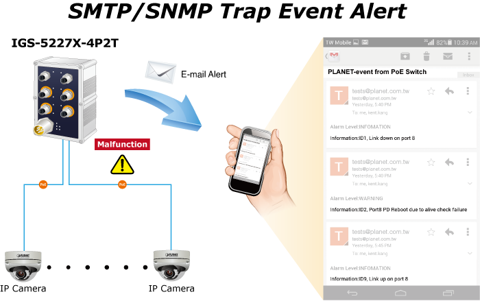Though most NVR or camera management software offers SMTP email alert function, the IGS-5227X-4P2T further provides event alert function to help to diagnose the abnormal device owing to whether or not there is a break of the network connection, loss of PoE power or the rebooting response by the PD Alive Check process.