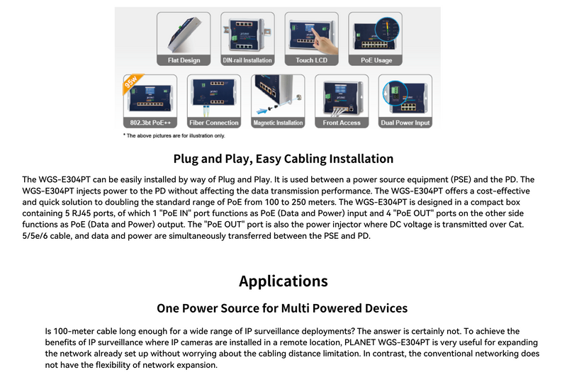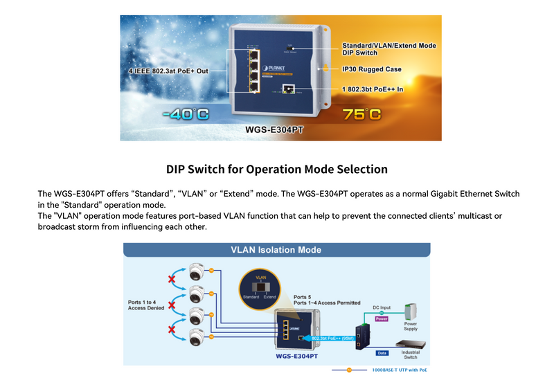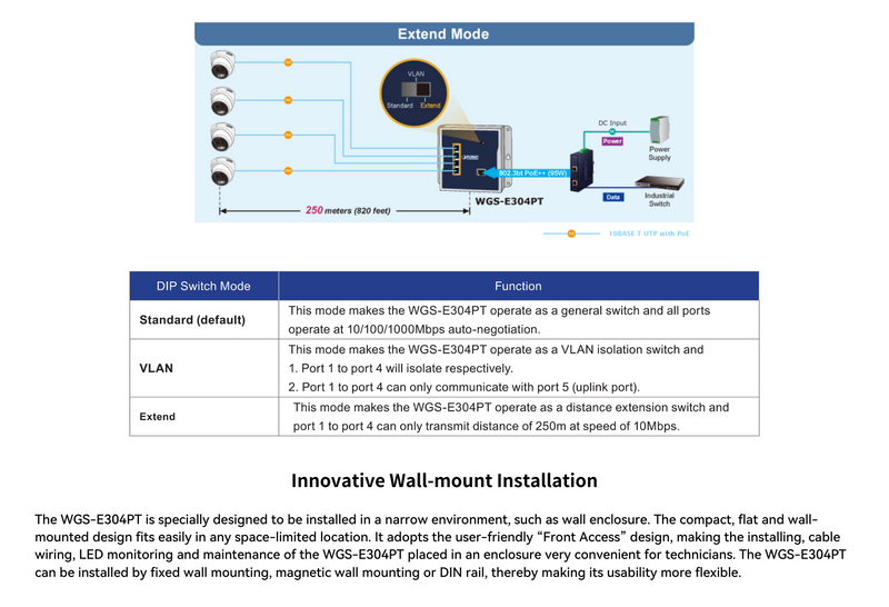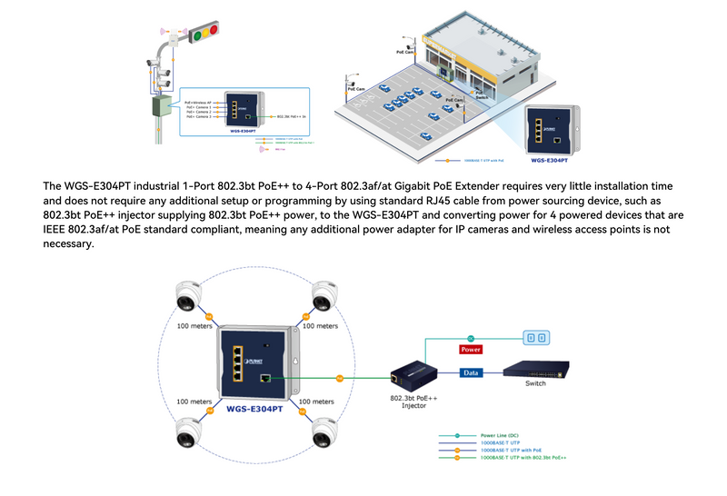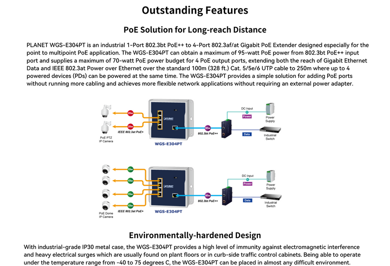 The WGS-E304PT is an industrial 1-Port 802.3bt PoE++ to 4-Port 802.3af/at Gigabit PoE Extender designed especially for the point to multipoint PoE application.