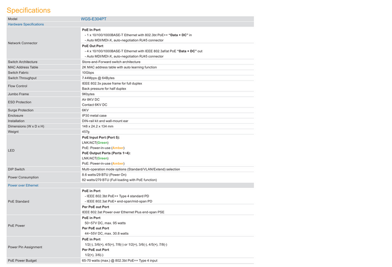 - Network Connector: 1 x 10/100/1000TX PoE In, 4 x 10/100/1000TX PoE Out