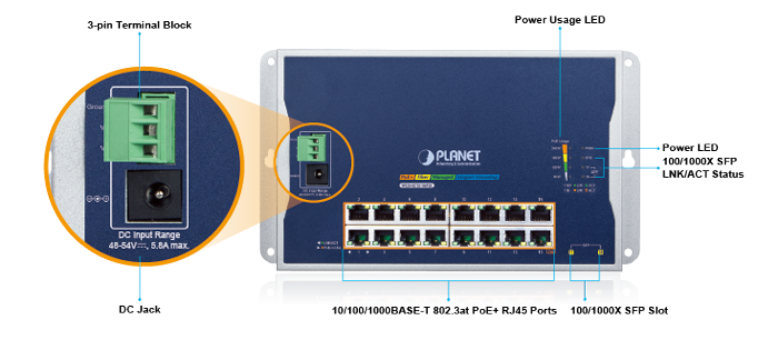 • DUAL POWER INPUT – Supports 48-54V DC via terminal block and DC jack (non-redundant) for flexible installation in space-constrained locations.