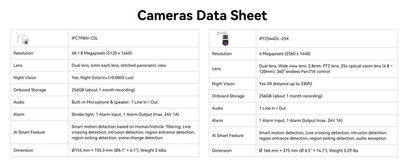 • 1x dual-lens stitched 8MP Panoramic camera with 256GB onboard storage (IPC7P8AI-CSL)