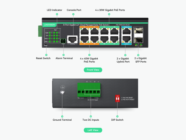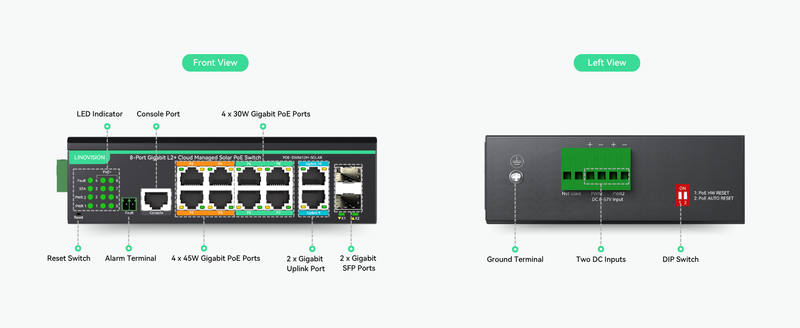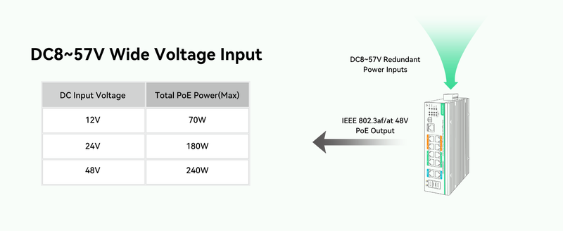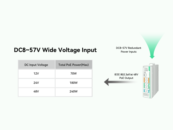 - DC8~DC57V POE VOLTAGE BOOSTER - Unlike traditional PoE Switch that requires DC 48V input from an AC power adapter, this Solar PoE Switch supports DC 8V ~ 57V input directly from solar power system or battery and provide standard IEEE802.3af/at PoE output. It is safer and more efficient in energy use.