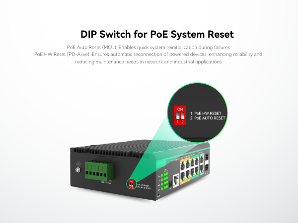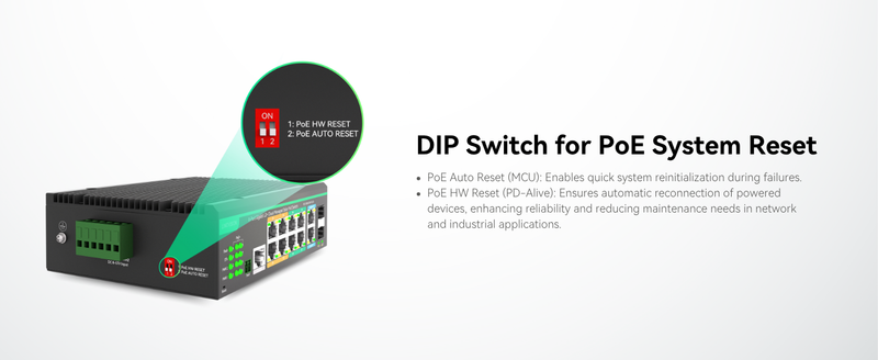 - REDUNDANT POWER SUPPLY - Support 2 channel DC12V-48V redundant power inputs and DIP Switch for PoE System Reset, ensure high reliability networking system.