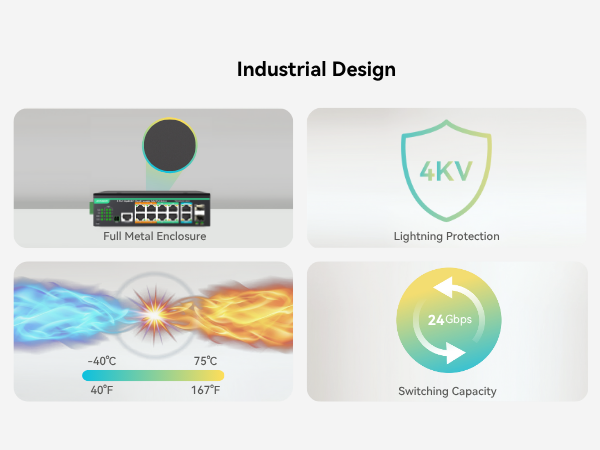 - INDUSTRIAL DESIGN - IP40 Metal shell & fanless design. Support DIN-rail or wall mounted installation. Wide working temperature -40℉ to +167℉(-40℃ to 75℃), 4KV surge immunity and 6KV ESD protection.