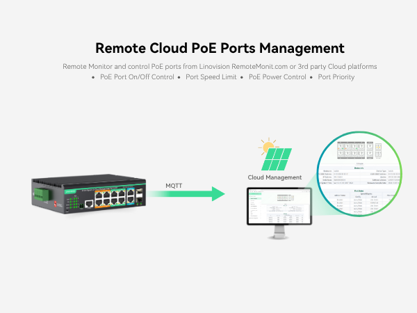 - L2+ REMOTE CLOUD MANAGED PoE SWITCH - Supports L2+ management functions like VLAN, QoS, ACL, Static Routing and Link Aggregation, as well as automatic ONVIF cameras discovery. Device management through WEB GUI, Telnet, SSH, CLI, SNMP, and MQTT Cloud (RemoteMonit Cloud)