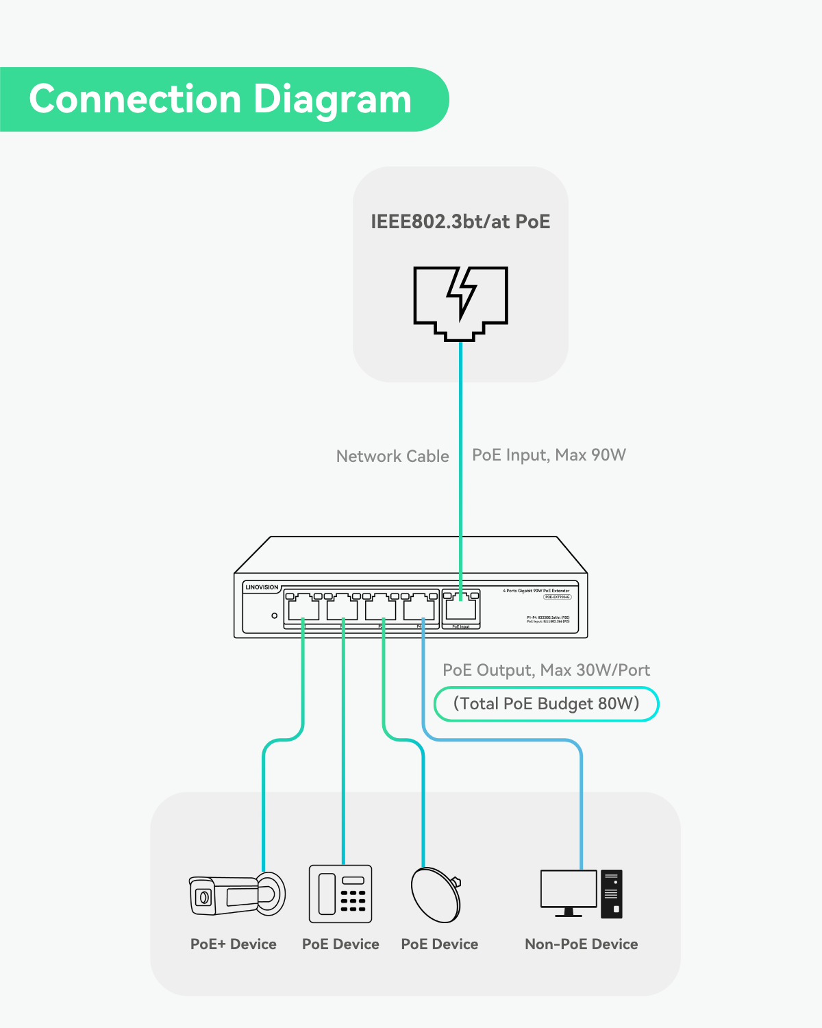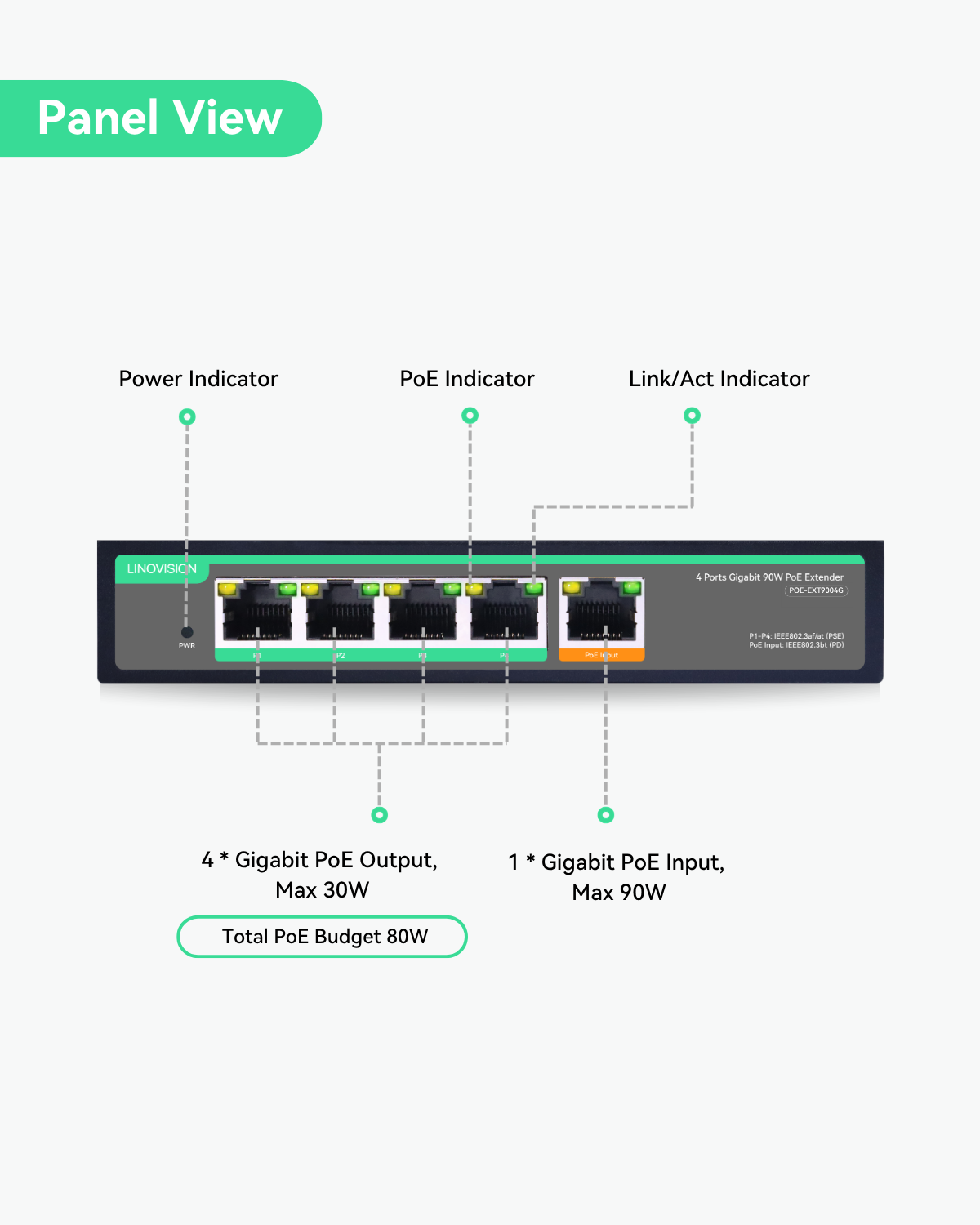 - 4CH BT90W PoE EXTENDER - 1 x IEEE 802.3af/at/bt POE Input, Max 90W; 4 x IEEE 802.3at/af PoE output. Total 80W PoE budget. PoE Input:Mode A/ Mode B; PoE Output: Mode A.