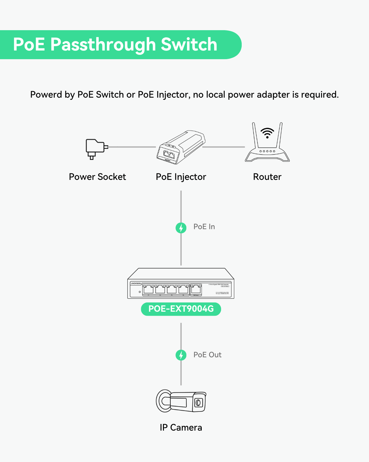 - PoE PASSTHROUGH SWITCH -Powered by POE Switch or PoE Injector, passes PoE power to other PoE devices, such as VoIP phones and cameras. Also know as PoE Powered Switch. No AC power supply required.