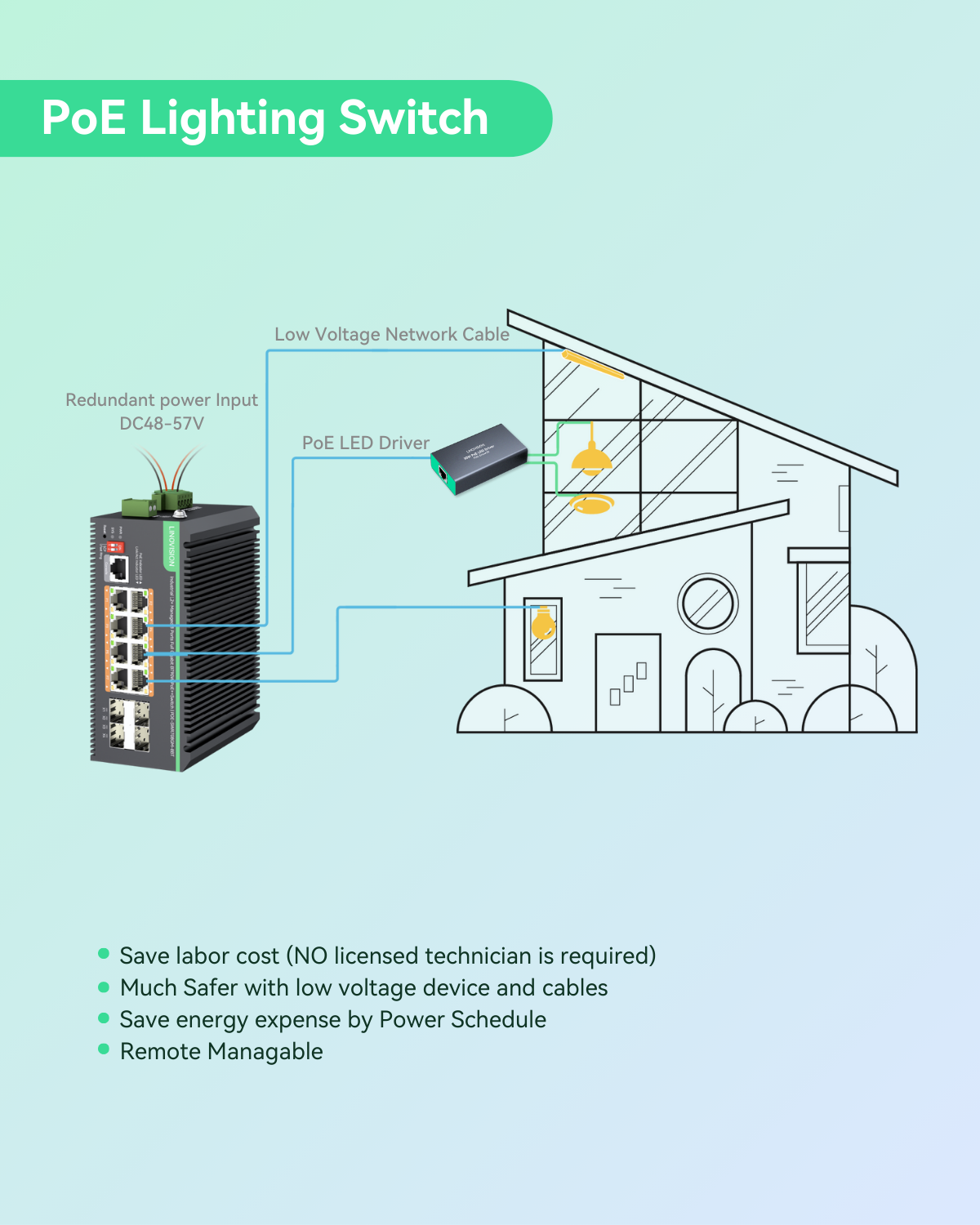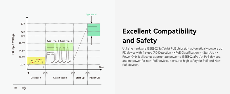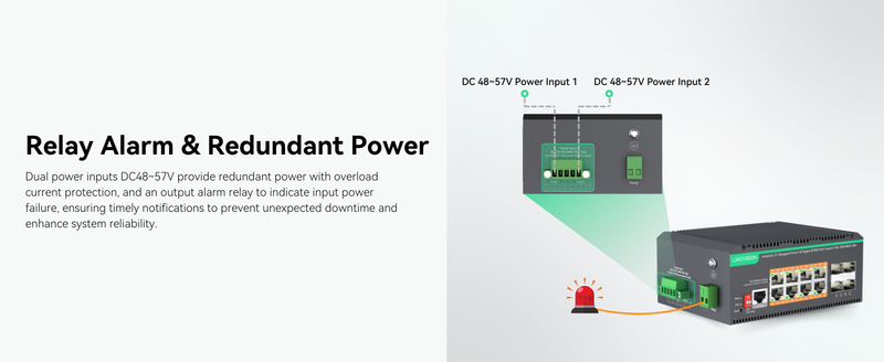 - Redundant Power Supply & Surge Protection - Supports dual DC48V–57V redundant power inputs with automatic failover, 6kV surge protection, and 8kV ESD protection to ensure a highly reliable network system. Effectively protects against power interruptions caused by thunderstorms or unexpected outages.