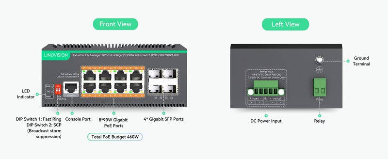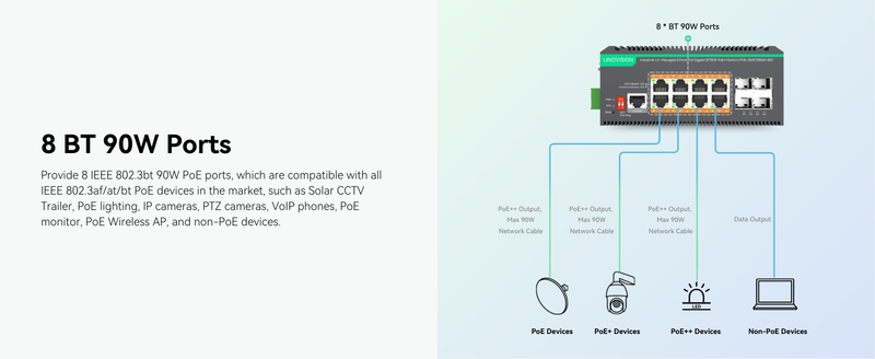 - 8 BT Full Gigabit PoE++ Switch - 8 x BT 90W output + 4 x Gigabit SFP Uplink Ports + 1 x RJ45 Console Port. Total PoE budget is 460W. Sufficient power for all IEEE 802.3af/at/bt PoE devices in the market.