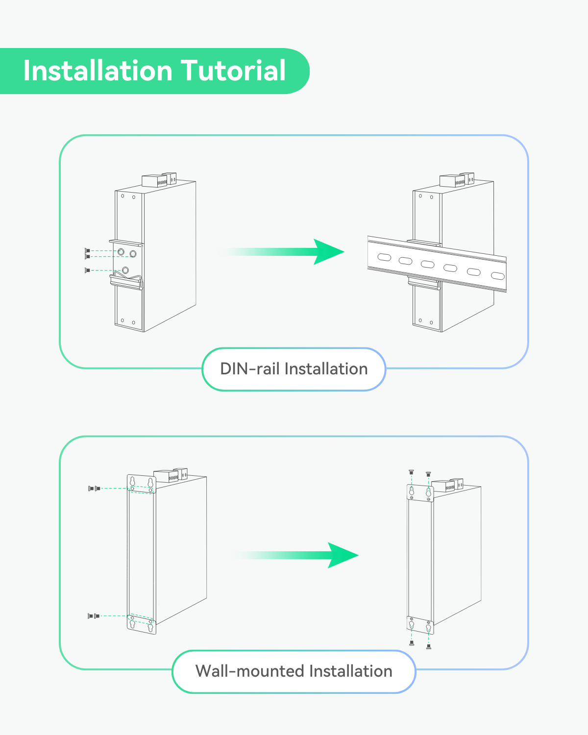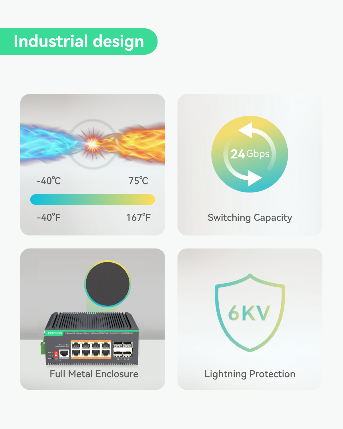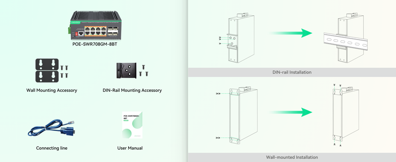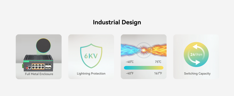 - Industrial Design - IP40 rated with aluminum housing and fanless design. Support DIN-rail or wall mounted installation. Wide working temperature -40℉ to +167℉(-40℃ to 75℃).