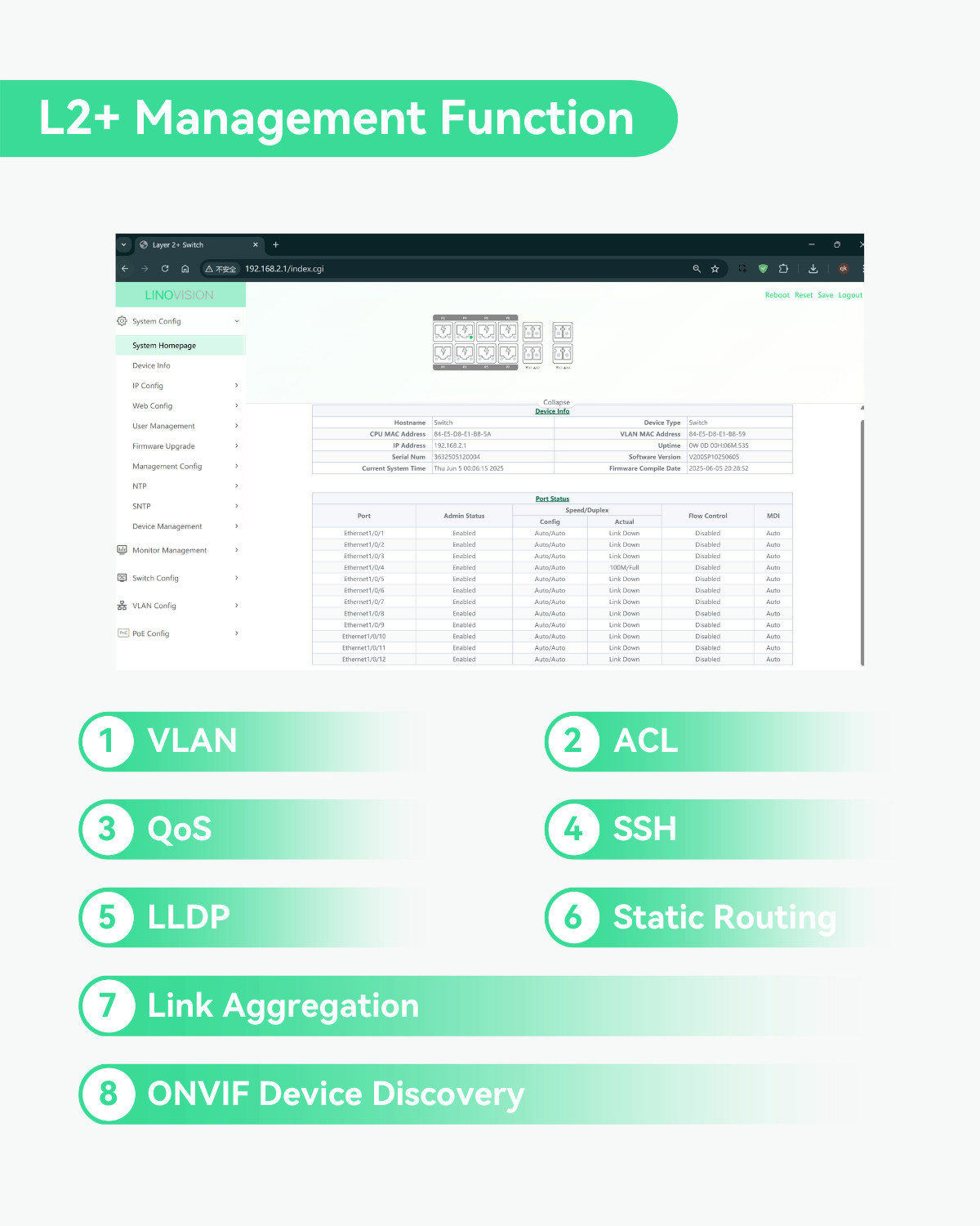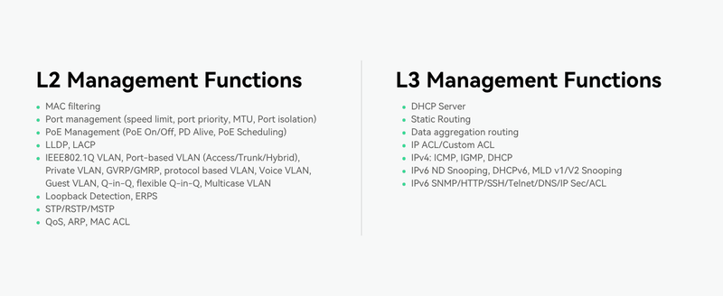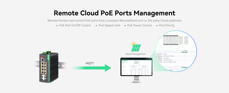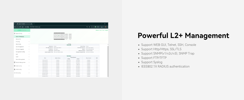 - L2+ Management and Remotely Cloud Access - Supports L2+ management functions like VLAN, QoS, ACL, Static Routing and Link Aggregation, as well as automatic ONVIF cameras discovery. Device management through WEB GUI, Telnet, SSH, CLI, SNMP, and MQTT Cloud (RemoteMonit Cloud)