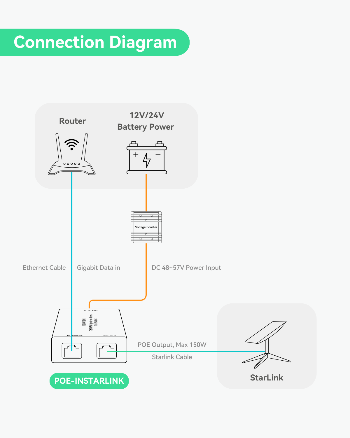 Plug-N-Play-Compatible with standard Starlink and Ethernet cables. Simply plug in the Ethernet cables and power cord, no configuration is needed.Attention:
