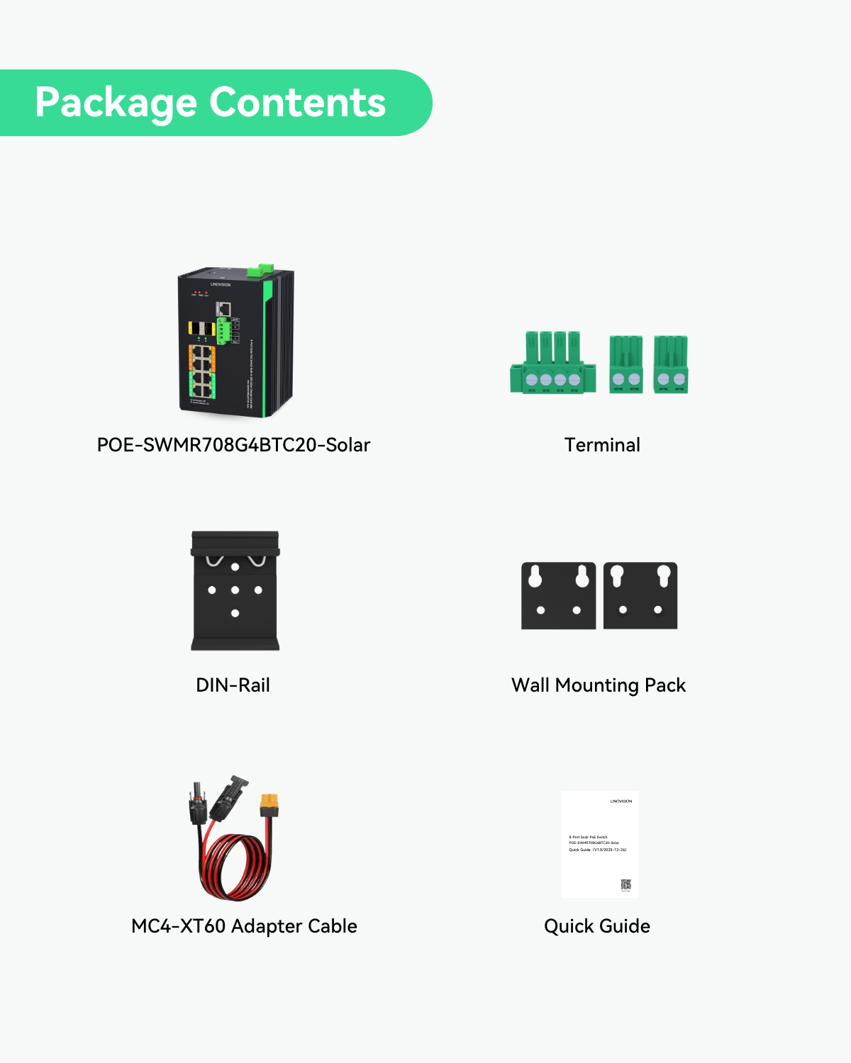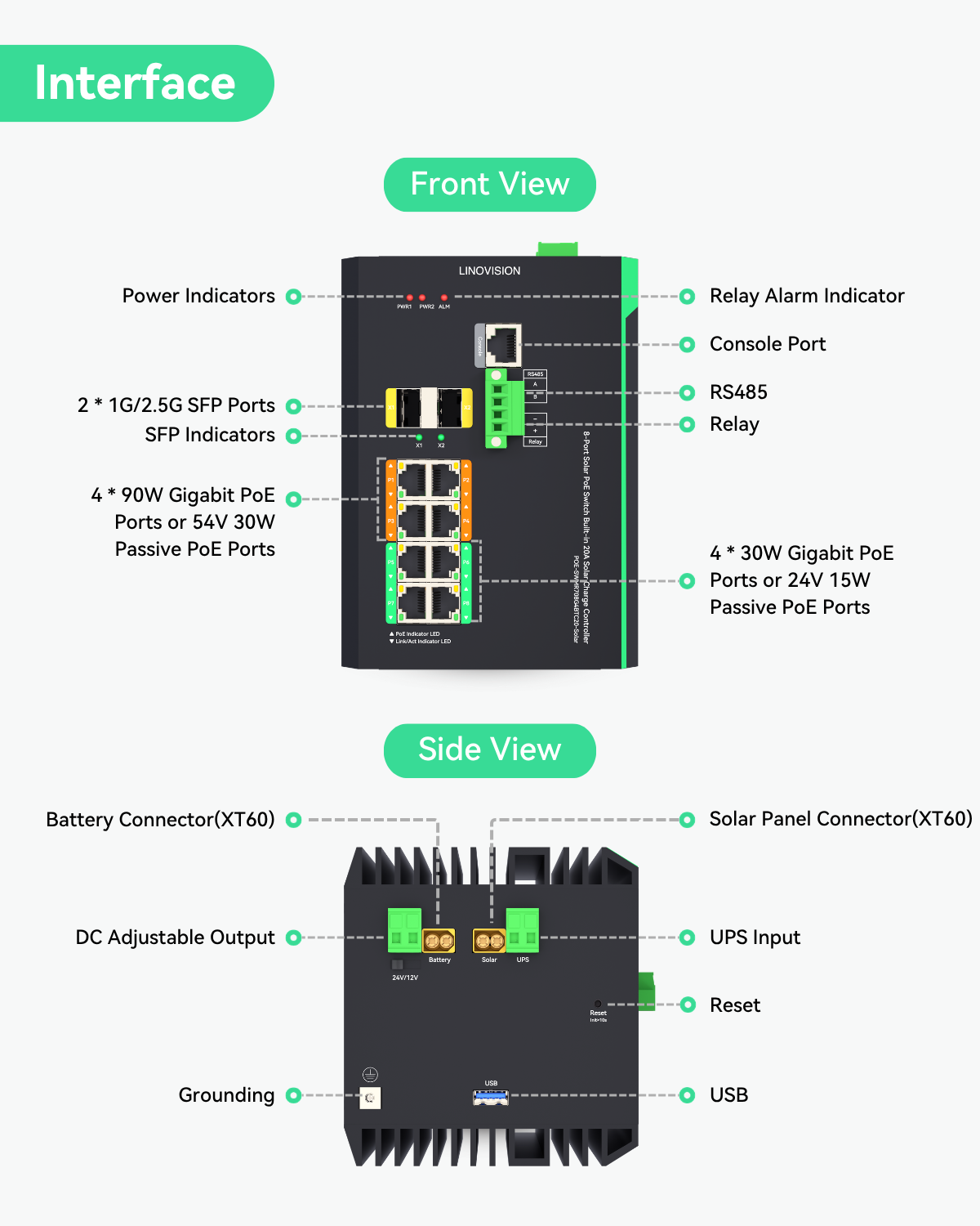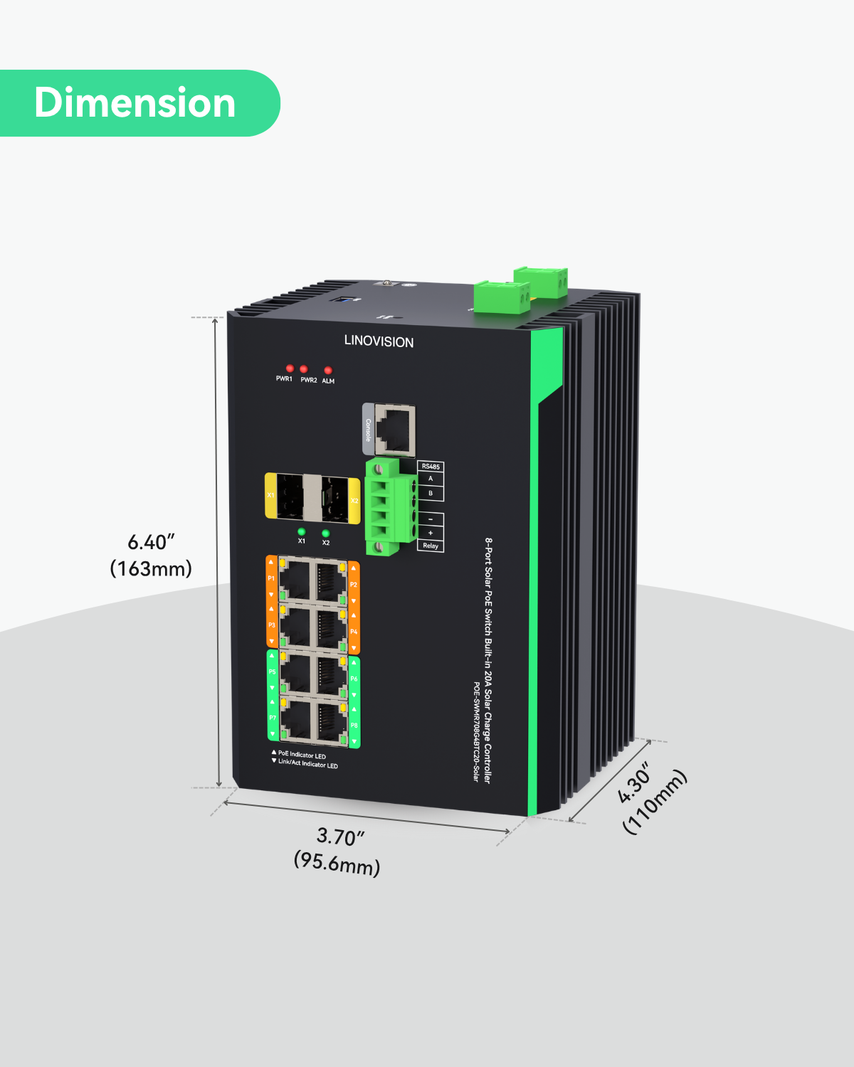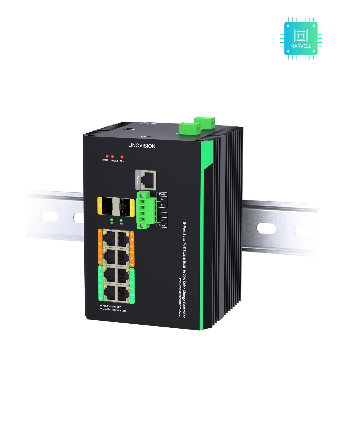 Industrial 8 Ports Managed Solar POE Switch Built-in Solar Charge Controller with 4 BT PoE ports,  DC12~57V Input