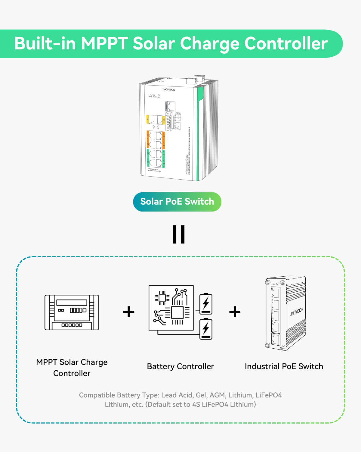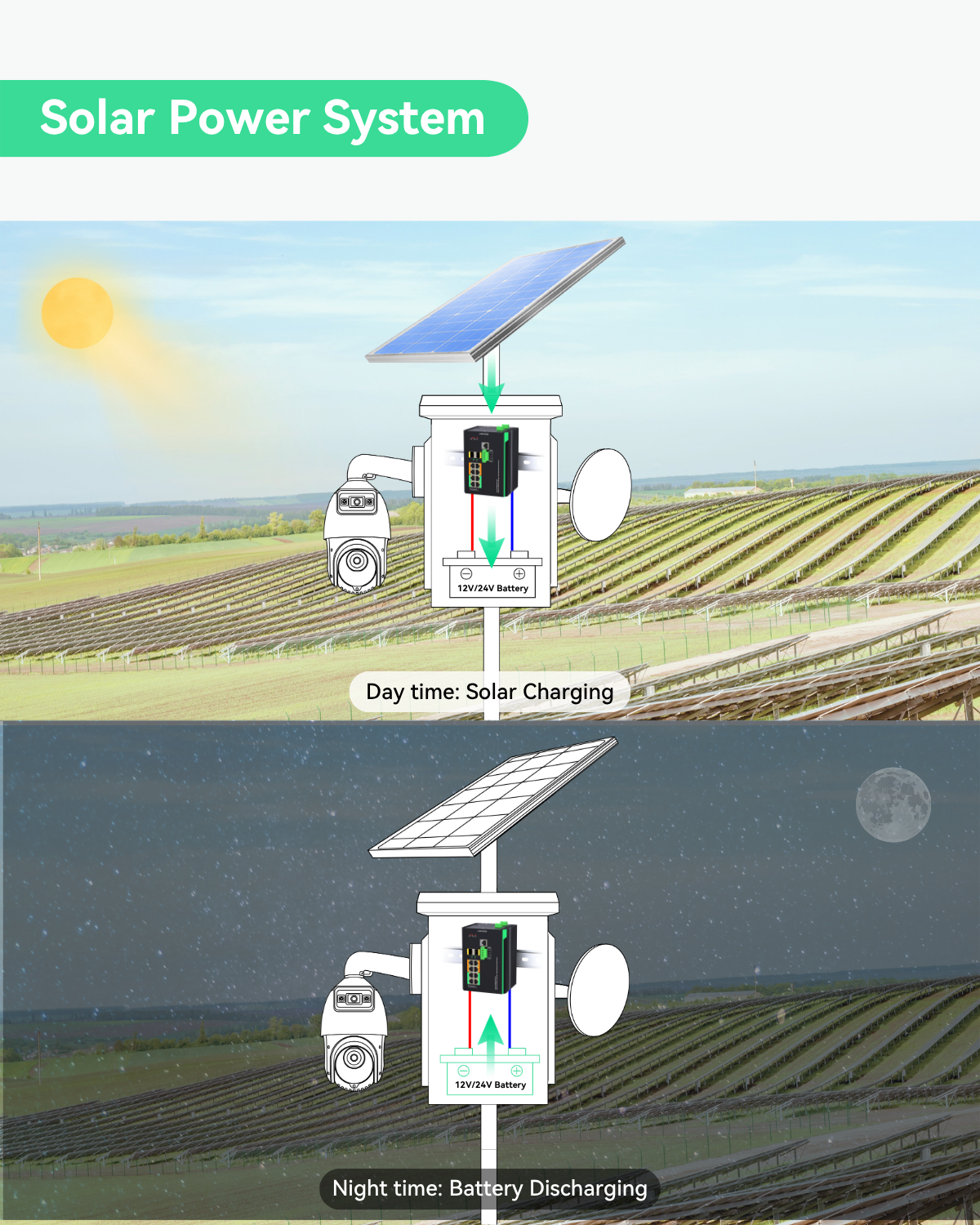 • 99% Efficient MPPT Controller - Built-in MPPT solar charge controller, working directly with PV solar panels and batteries to supply non-stop PoE power. Maximum Power Point Tracker charging technology with up to 99% tracking efficiency and 98% peak PV conversion efficiency.
