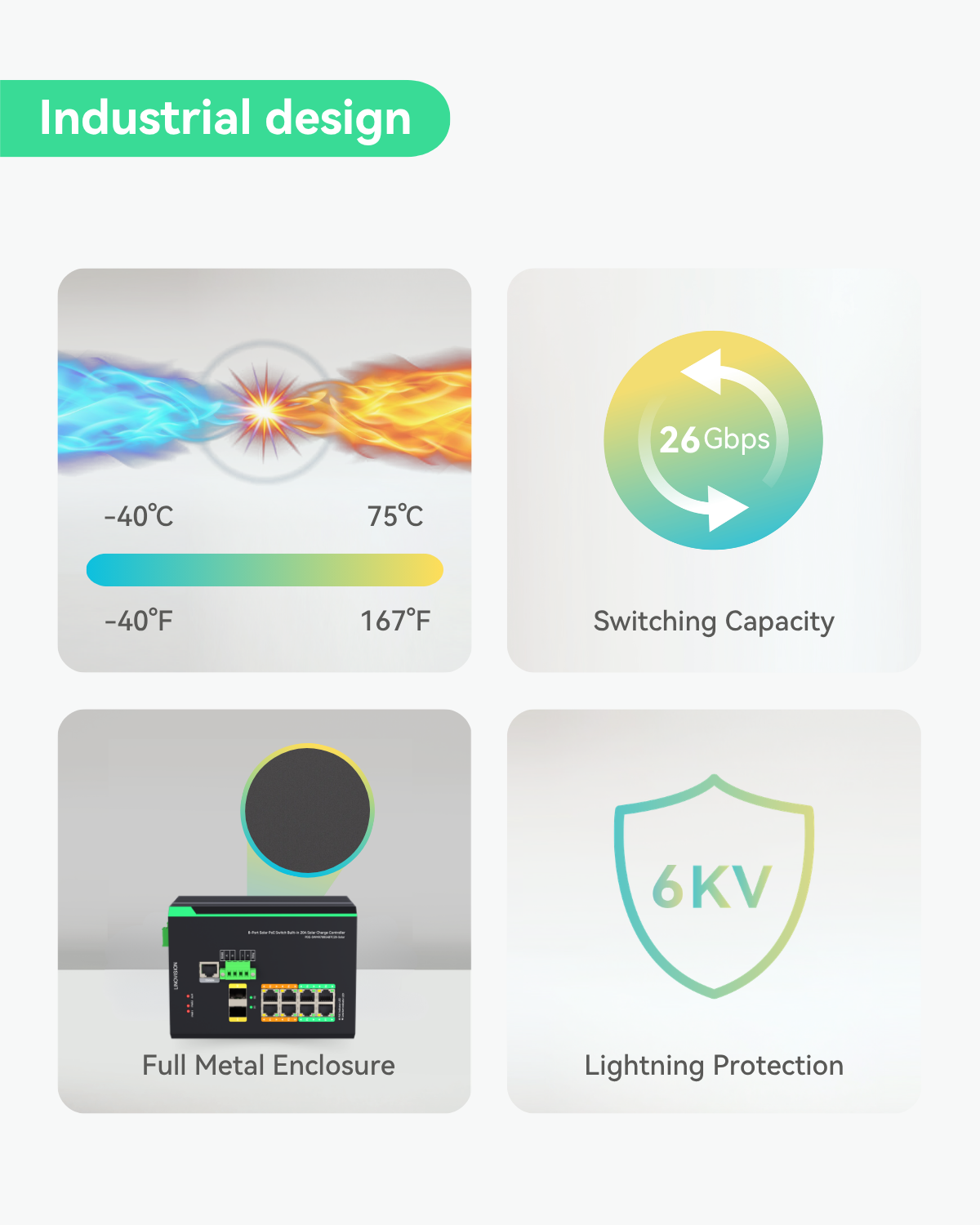 • Fanless Industrial Design - Designed for harsh environment, 6KV surge protection, 8KV ESD protection, working environment (-40℃ ~ +75℃ or -40 ℉ ~ +167 ℉)