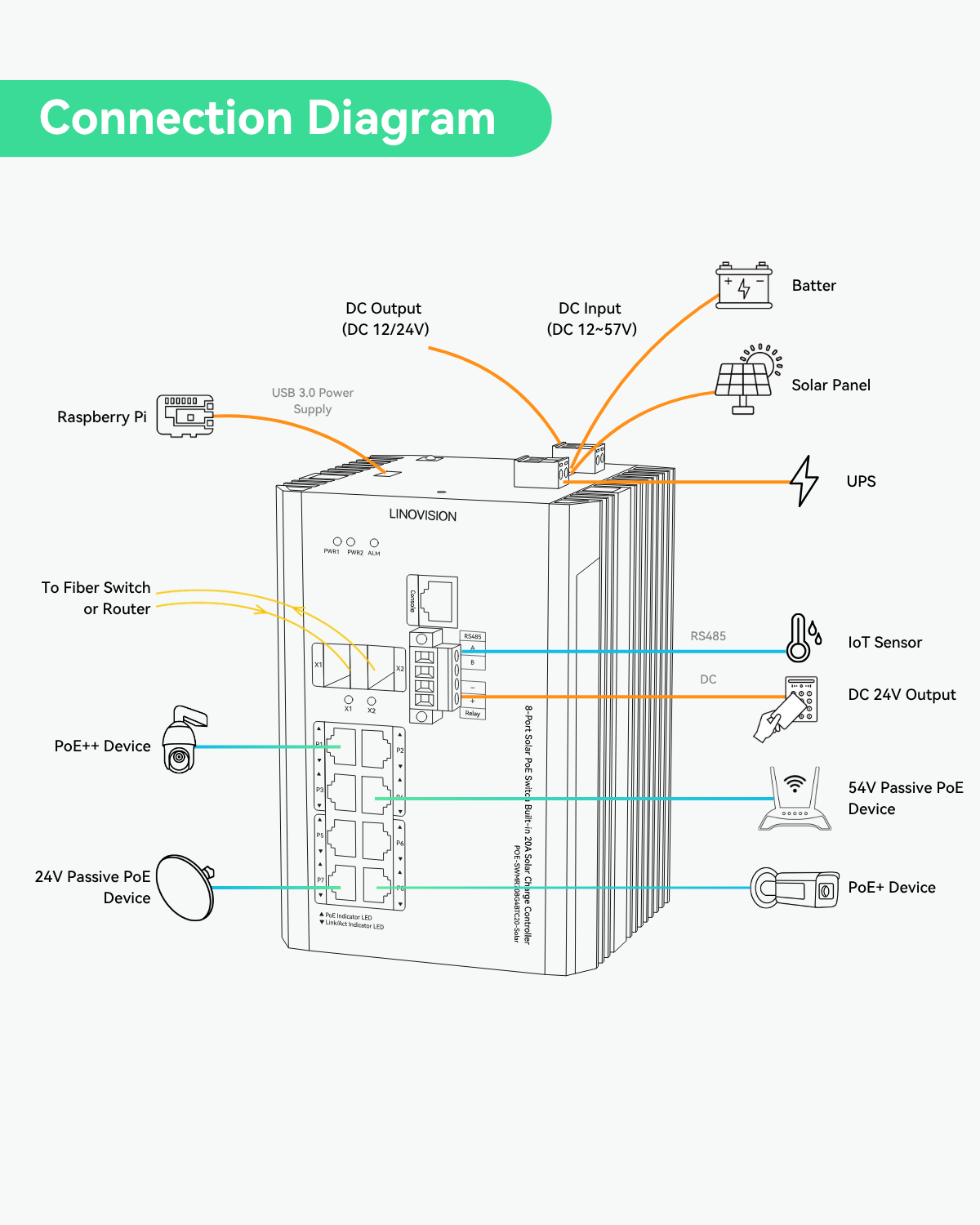 • DC12~57V WIDE VOLTAGE INPUT - Dual redundant DC12~57V input channels. It is designed for reliable PoE power output in solar power systems, vehicles or other applications that without AC power input.