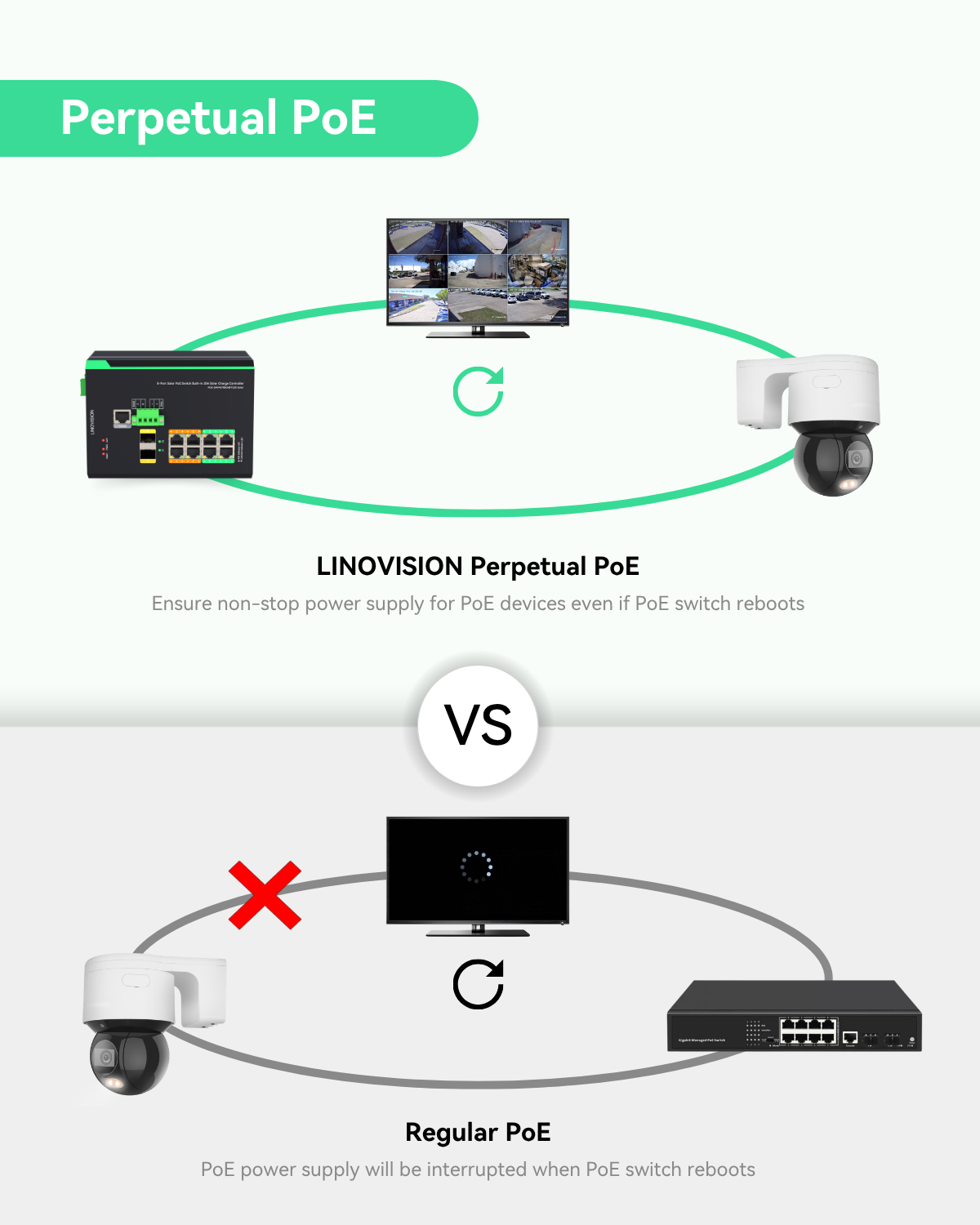 • PoE Watchdog and P-PoE - Its PoE watchdog technology enables continuously monitoring PoE ports and automatically reboot PD device if it is freezing, and the Perpetual PoE ensure non-stop PoE supplying even if the switch is restarting.