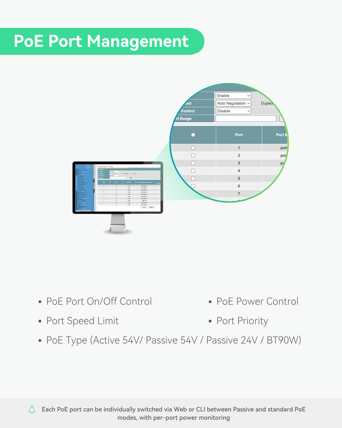 • Passive 54V/24V PoE Output and 24V DC Output- Each port can be individually switched via Web or CLI between Passive and standard PoE modes, with per-port power monitoring; ideal for wireless APs, wireless bridges, or other devices that accept 54V/24V Passive PoE—no extra PoE injector needed. Provides 12V/24V DC,  for Non-POE IP cameras, access reader terminals, IP speakers, Routers, etc.