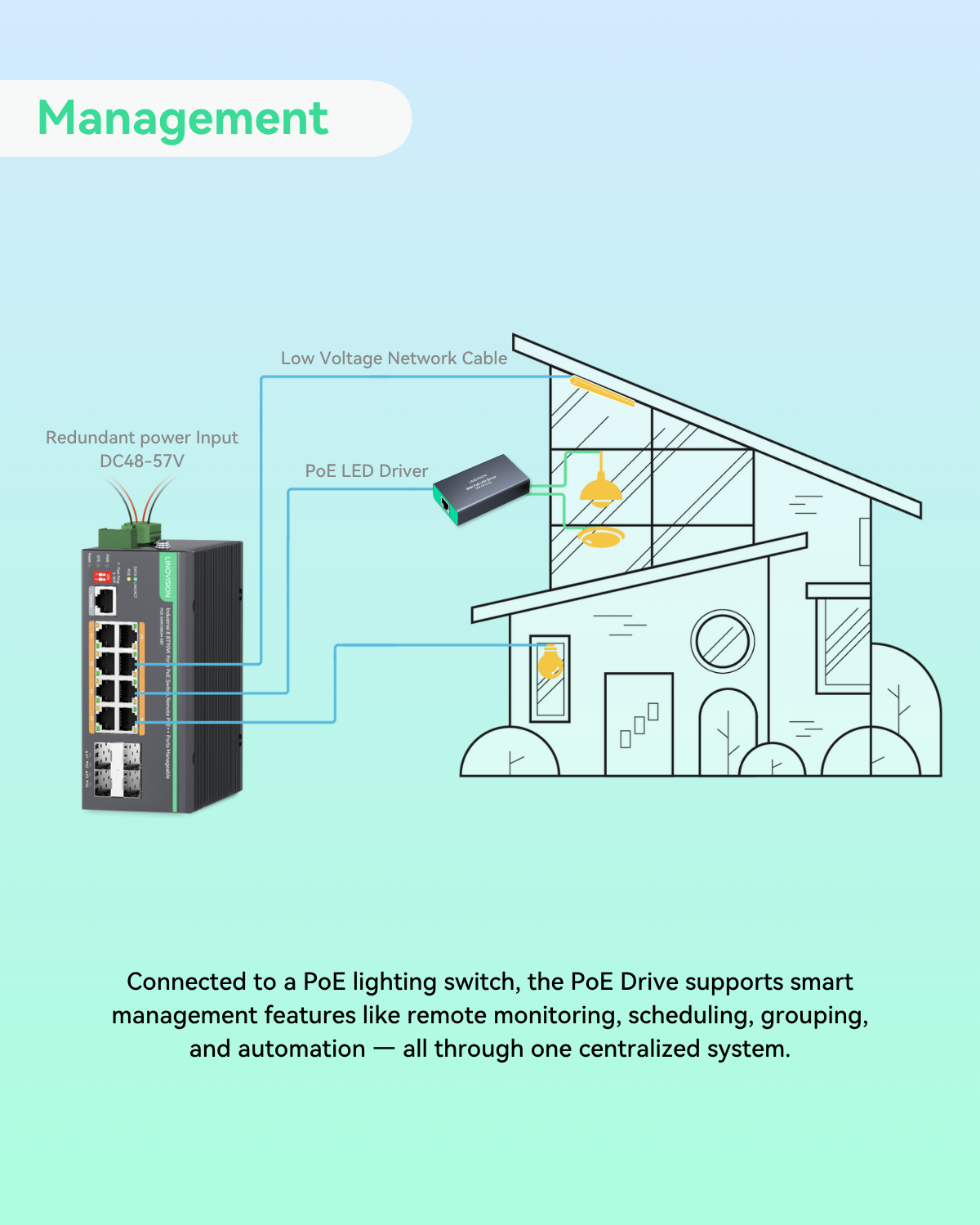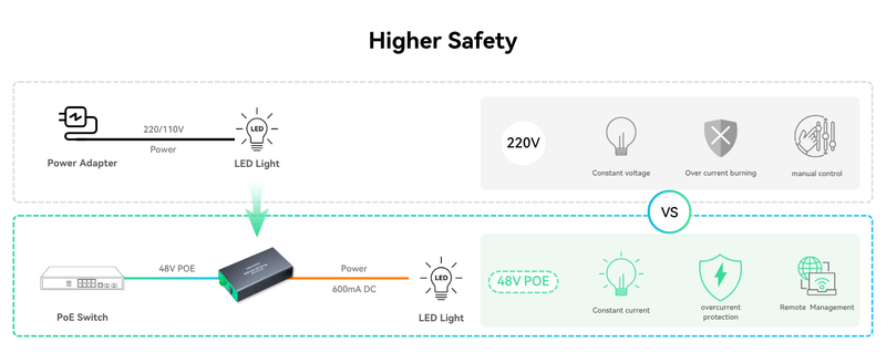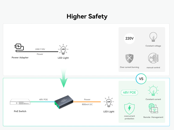• High safety - Unlike regular AC powered LED lights, PoE lighting system adopts DC48V low voltage system. It eliminates the risk of electricity shock, therefore, no electricity license is required to install the system.