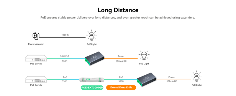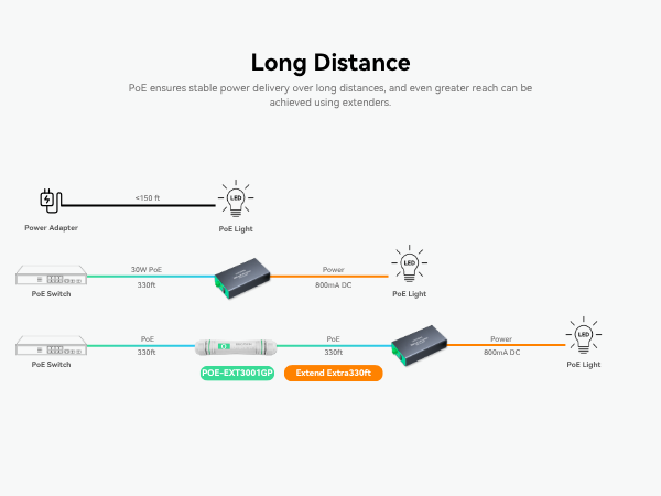 • Long distance transmission - By utilizing PoE extenders especially with UltraReach PoE technology, the transmission distance can be up to 1,000 meters. This make the cabling work super flexible.