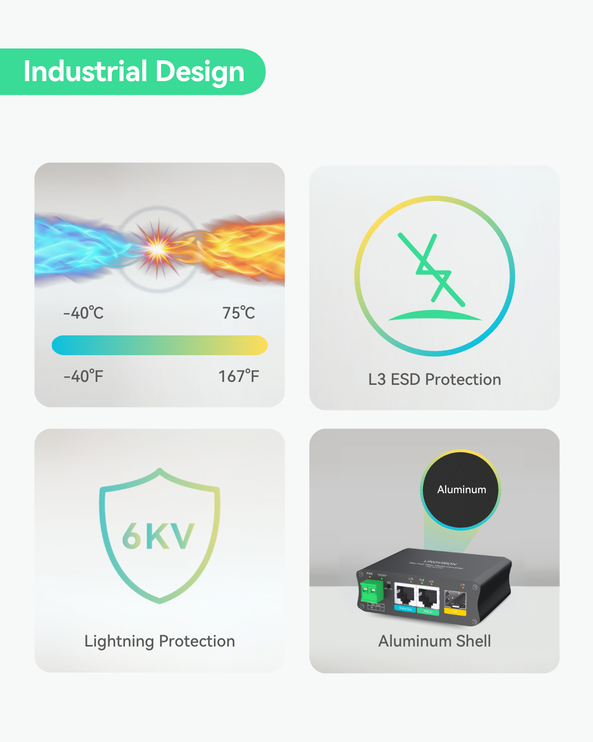 • PoE Fiber Media Converter - Convert 30W PoE to switchable 12/24V DC, Gigabit data, and SFP fiber for super long distance data transmission