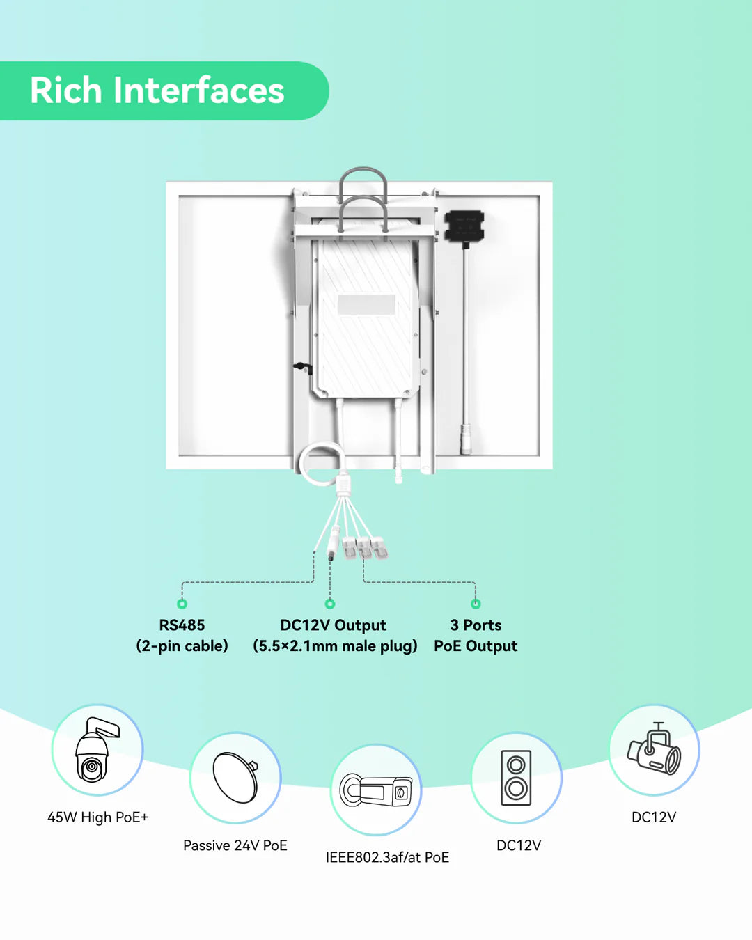 - RICH INTERFACES - 3 Ports PoE Output, DC12V Output (2-pin cable), RS485 (2-pin cable) for remote charge status monitoring
